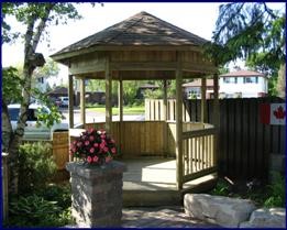 wooden base, structure, shingles, railing, octagonal design